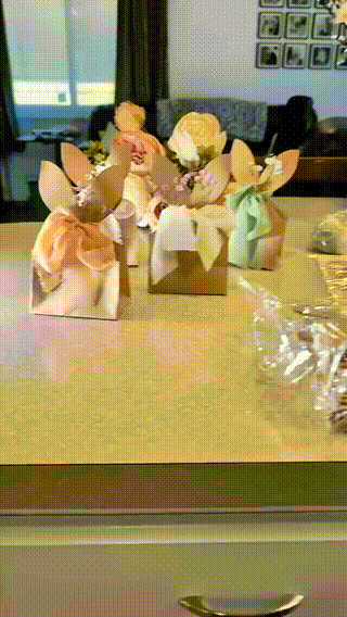 Disse påskegodteposene i boho-stil gir en varm og naturlig touch til vårens feiringer. De er designet med søte kaninører og pyntet med nøytrale sløyfer og delikate kunstige blomster, og gjør enkle godbiter til vakkert presenterte gaver.