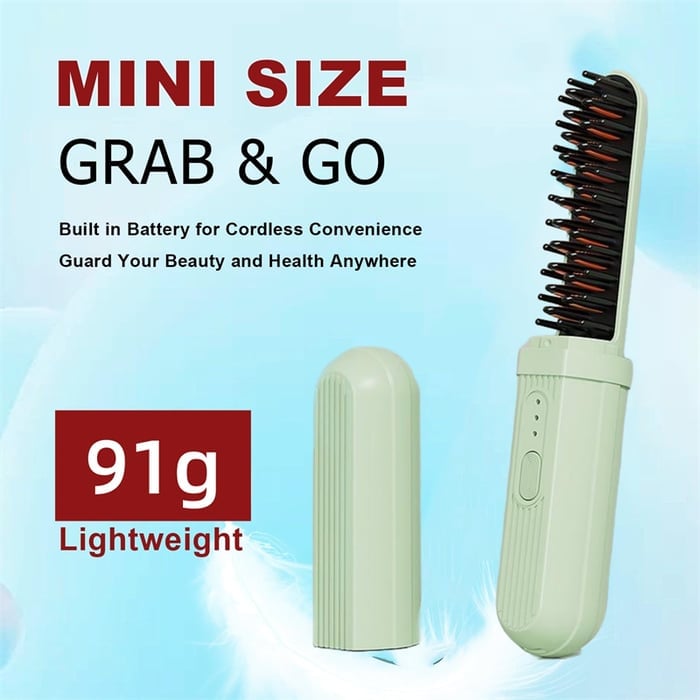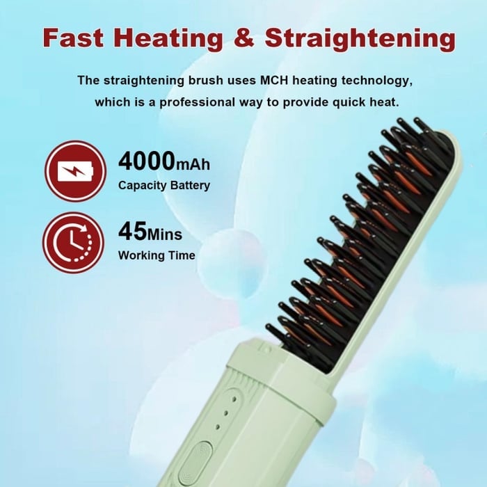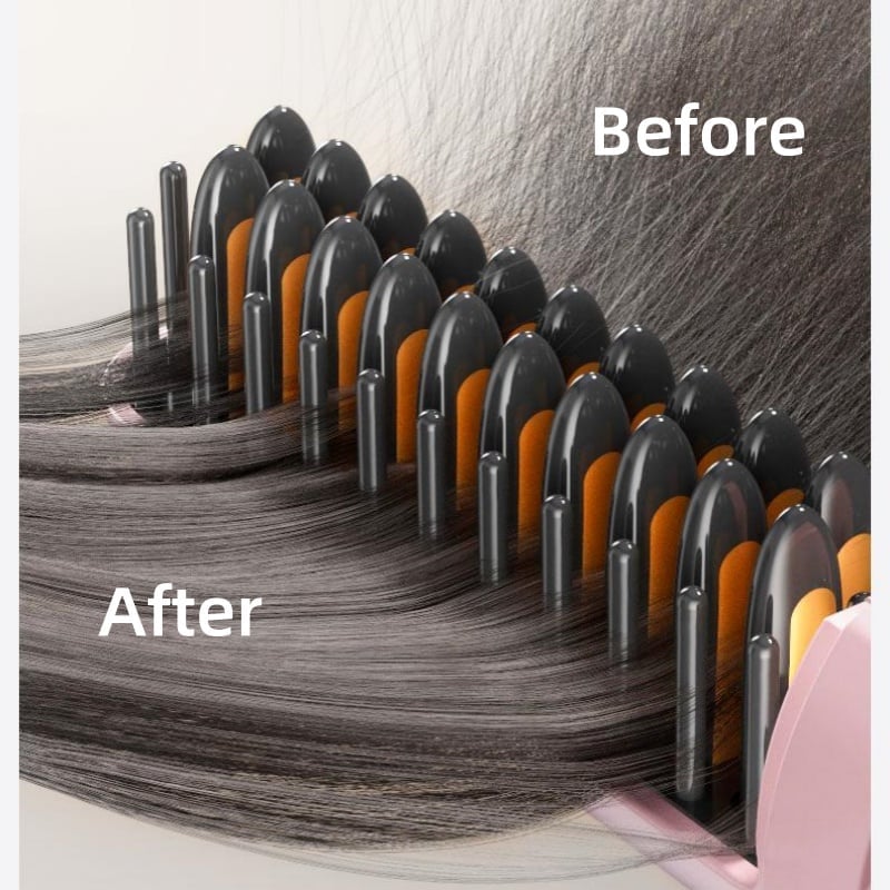 Die Glättungsbürste ist auf einfache Handhabung und Tragbarkeit ausgelegt, d. h. Sie können sie überall verwenden, ohne sich Gedanken über die Suche nach einer Steckdose oder ein verheddertes Kabel machen zu müssen. Ihr kompaktes und leichtes Design macht es einfach, sie mitzunehmen, so dass Sie immer gut aussehen können.